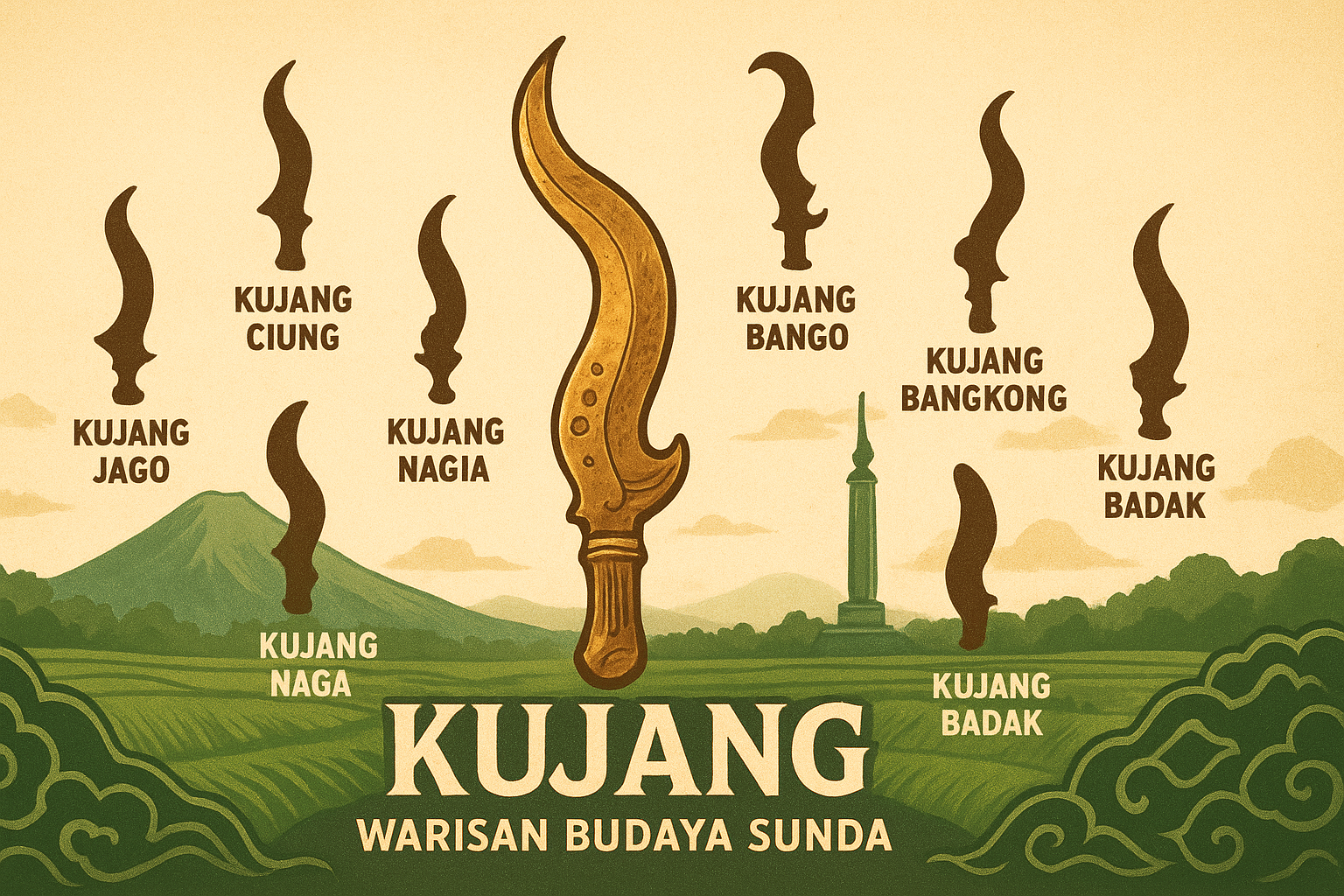 - Kujang Naga – Menggabungkan unsur burung, ular, dan rusa; pusaka kerajaan dan simbol kekuatan kosmis.