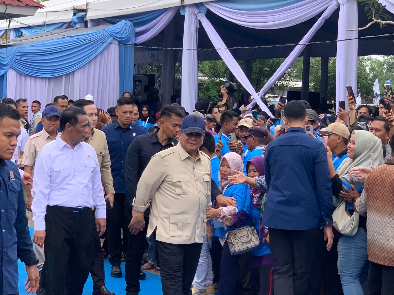 Presiden Prabowo tiba di lokasi acara sekitar pukul 11.13 WIB dengan mengenakan pakaian safari berwarna krem. Dari atas kendaraan, Presiden menyapa masyarakat dan para petani yang telah memadati area Panen Raya dan Pengumuman Swasembada Pangan.