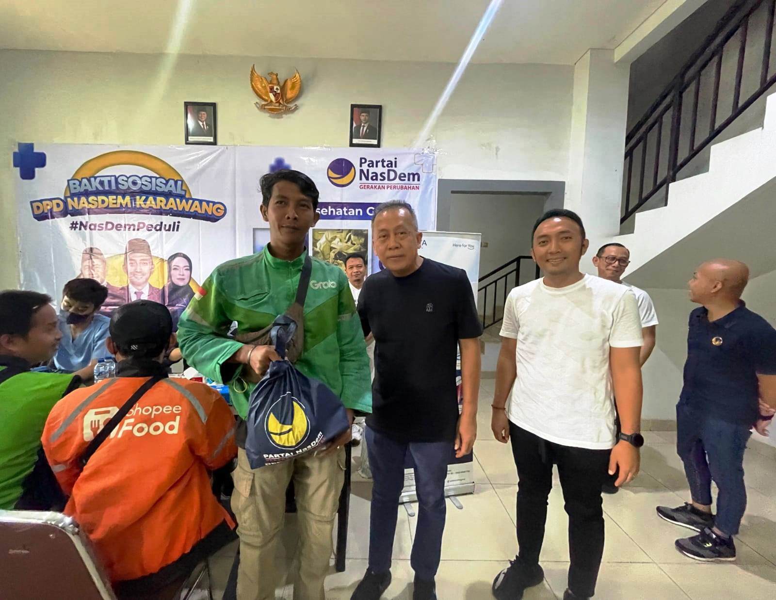 KARAWANG, RAKA- Partai NasDem bagikan paket sembako untuk ojek online (ojol) di Karawang. Selain dibagi sembako, pengemudi ojok juga diperiksa kesehatannya.
