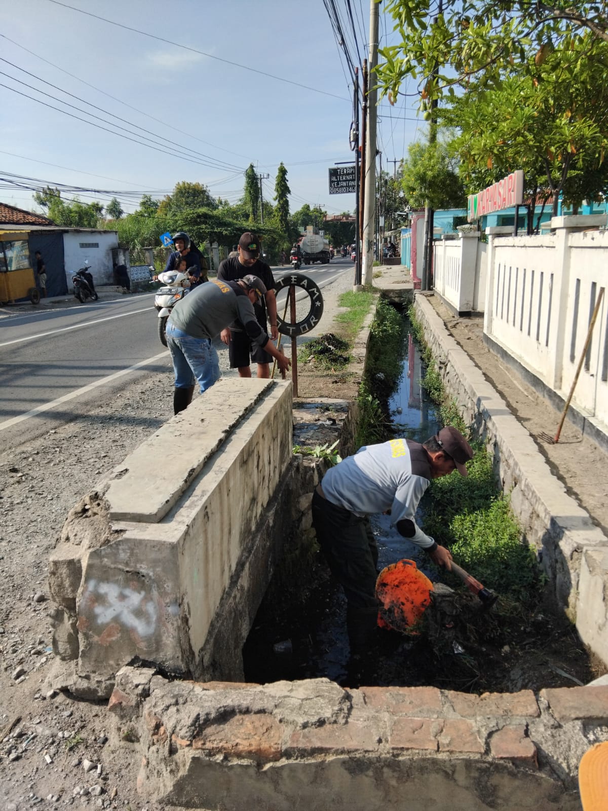 KERJA BAKTI: Aparat Desa Karyasari, Kecamatan Rengasdengklok, membersihkan saluran air di depan Kantor Desa Karyasari.