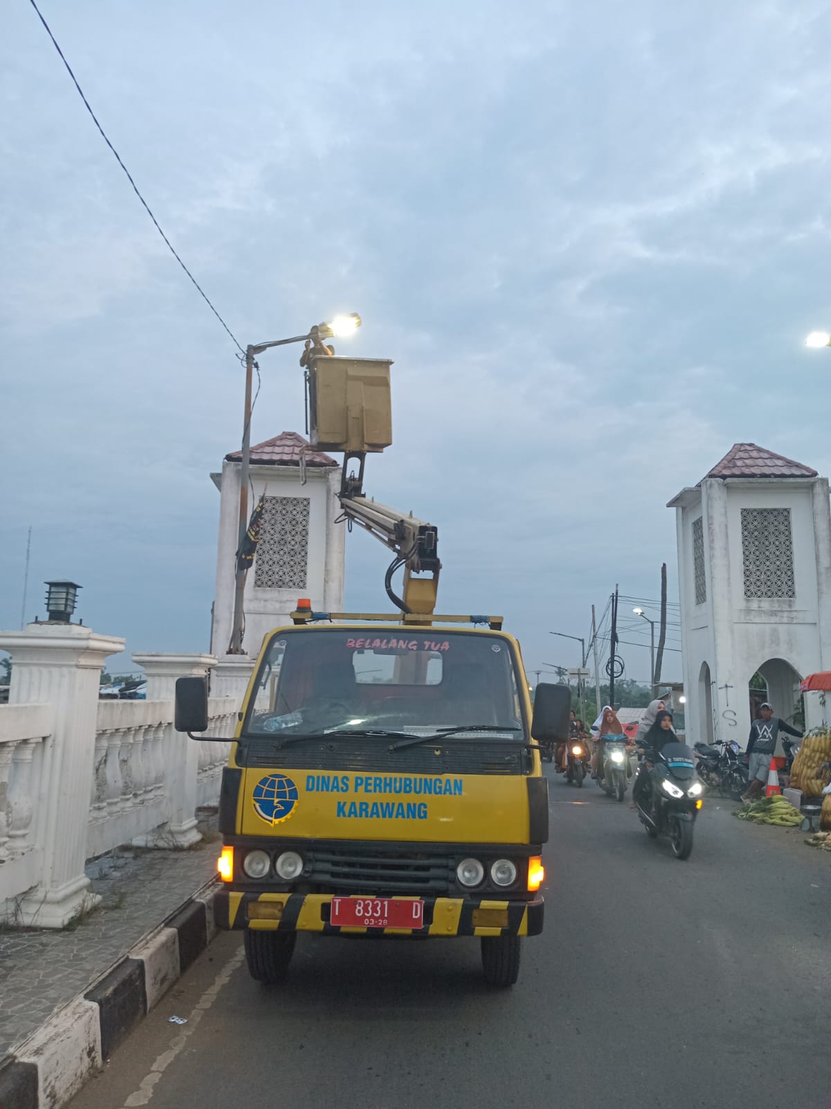 PERBAIKAN PJU: Pegawai Dinas Perhubungan (Dishub) Kabupaten Karawang memperbaiki lampu Penerangan Jalan Umum (PJU) yang sudah rusak di area Jembatan Perbatasan Karawang-Bekasi.