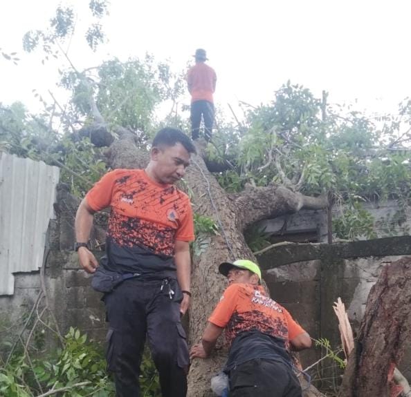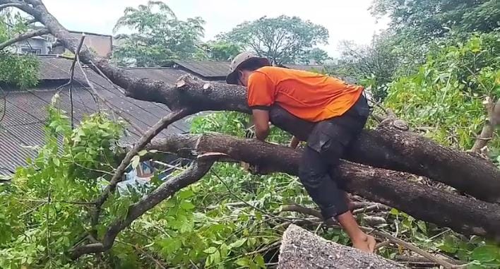 Selain menyalurkan bantuan, mereka juga sigap membereskan pohon tumbang yang nemimpa rumah warga di Warung Bambu, Kecamatan Karawang Timur, Karawang, Jawa Barat, Selasa (13/1).