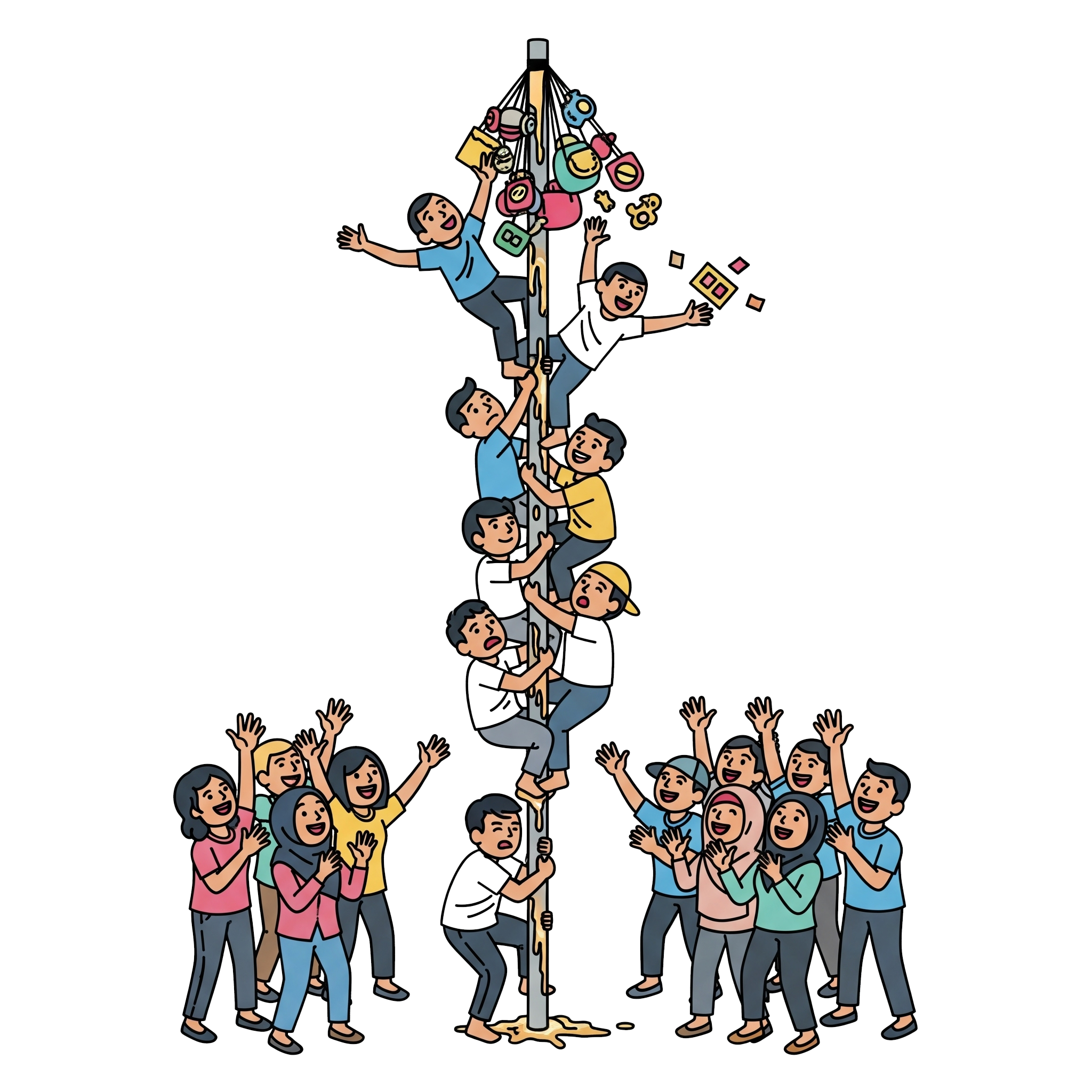 Sebanyak 15 titik panjat pinang digelar serentak di setiap Rukun Tetangga (RT). Antusiasme warga, baik anak-anak, remaja maupun orang dewasa, terlihat saat sejumlah peserta berebut hadiah di atas batang bambu yang telah dilumuri oli. Suasana riuh penuh sorak sorai menjadi tanda kegembiraan sekaligus kebersamaan.
