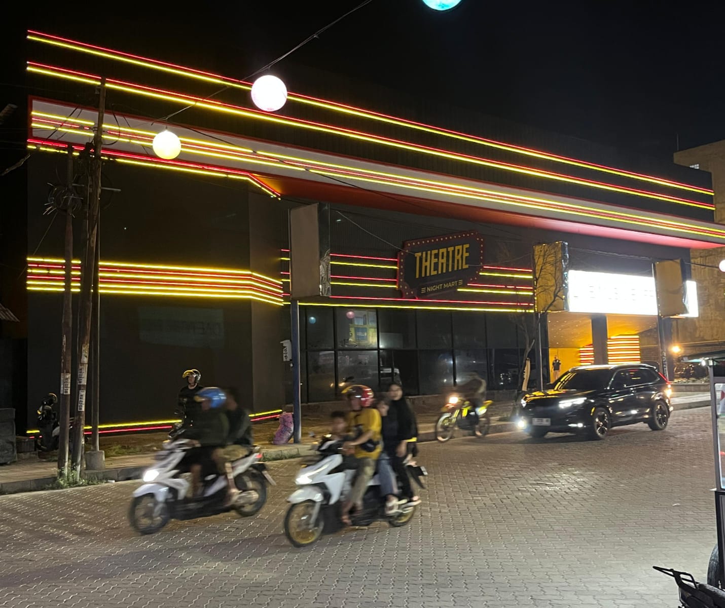 Pantauan pada Selasa malam (6/1) sekitar pukul 19.30 WIB menunjukkan area Theatre Night Mart tampak terang oleh nyala lampu. Beberapa sepeda motor terlihat terparkir di sekitar lokasi, sementara petugas parkir berjaga seperti layaknya tempat usaha yang mulai aktif.