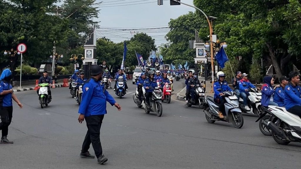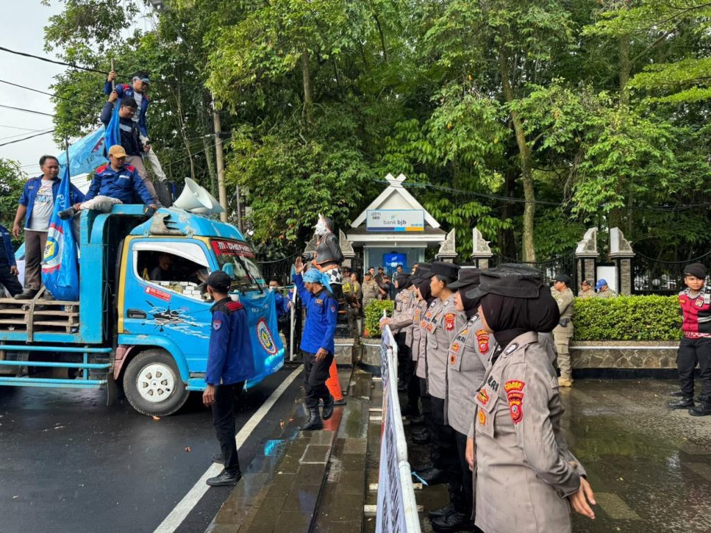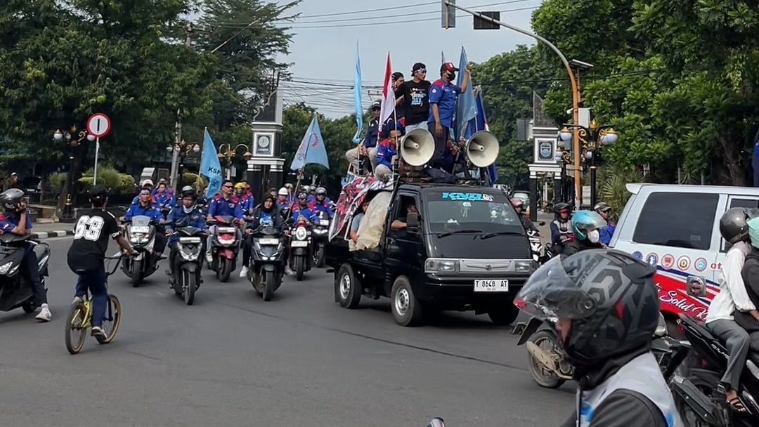 UNJUK RASA: Ratusan buruh di Purwakarta yang tergabung dari berbagai elemen melakukan unjuk rasa kenaikan UMK 2026 pada Senin (22/12). Aksi unjuk rasa dilakukan dengan long march di ruas jalan utama sehingga nyaris melumpuhkan arus lalu lintas sementara sebelum akhirnya tiba di kantor Pemkab Purwakarta.