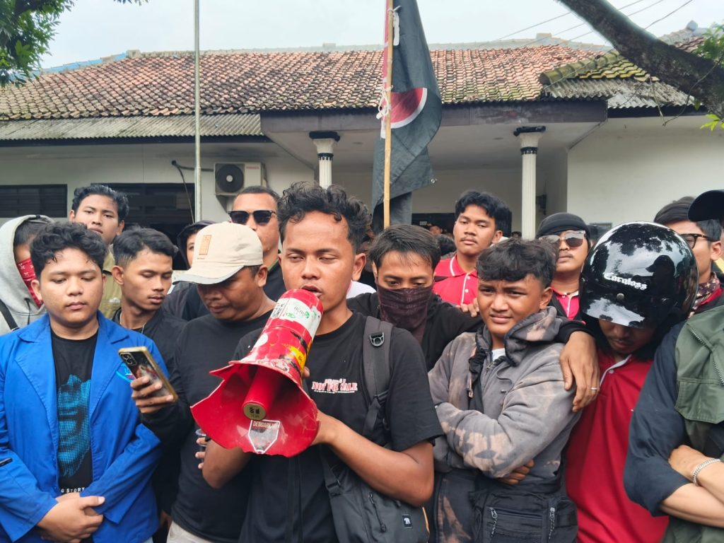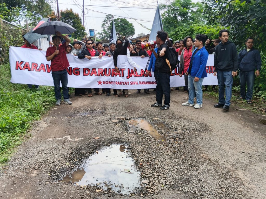 UNJUK RASA: Berbagai elemen pemuda dan masyarakat berunjuk rasa di depan kantor PPK 1.1 Jawa Barat di Cikampek, menuntut agar jalan rusak segera diperbaiki.